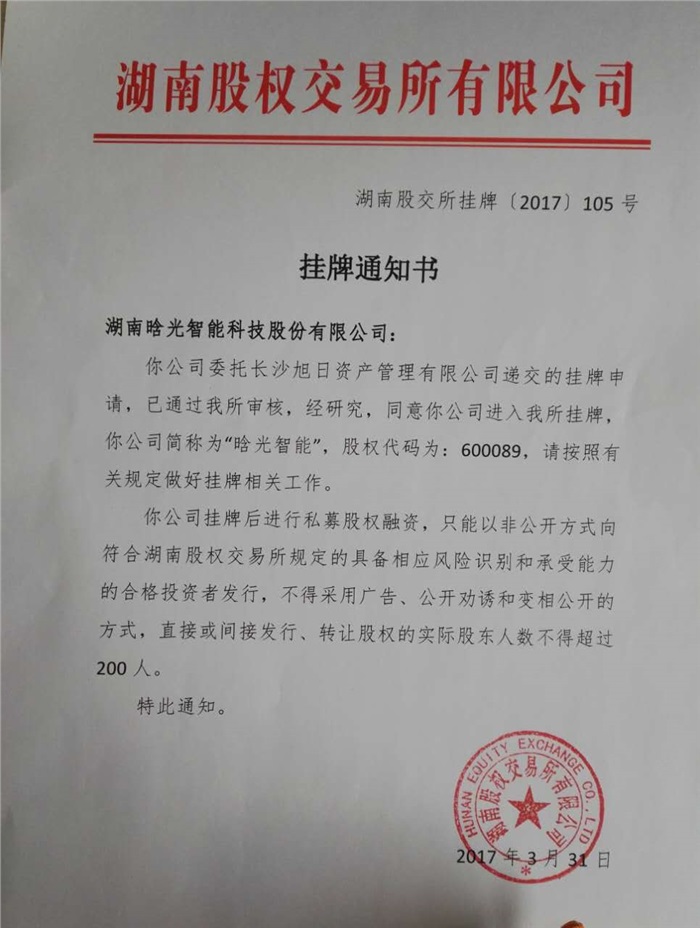 湖南晗光智能科技股份有限公司于3月31日在湖南股權交易所成功掛牌四板(標準